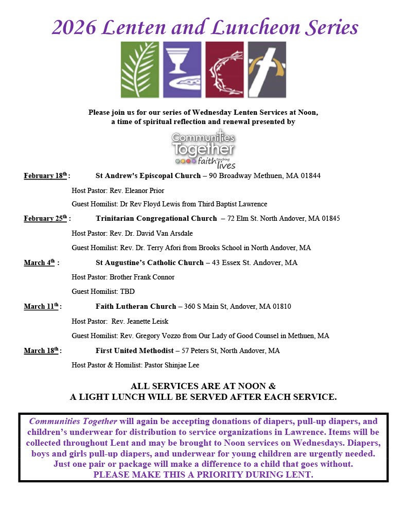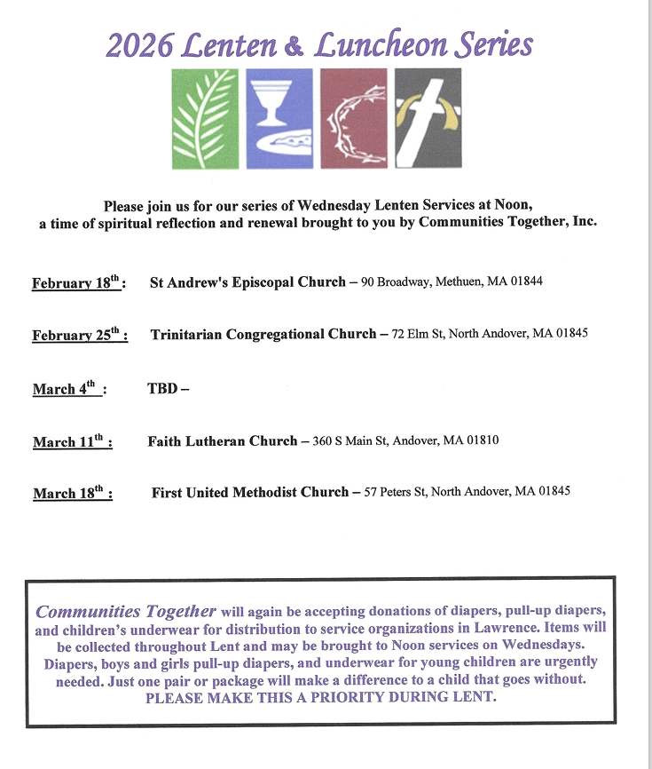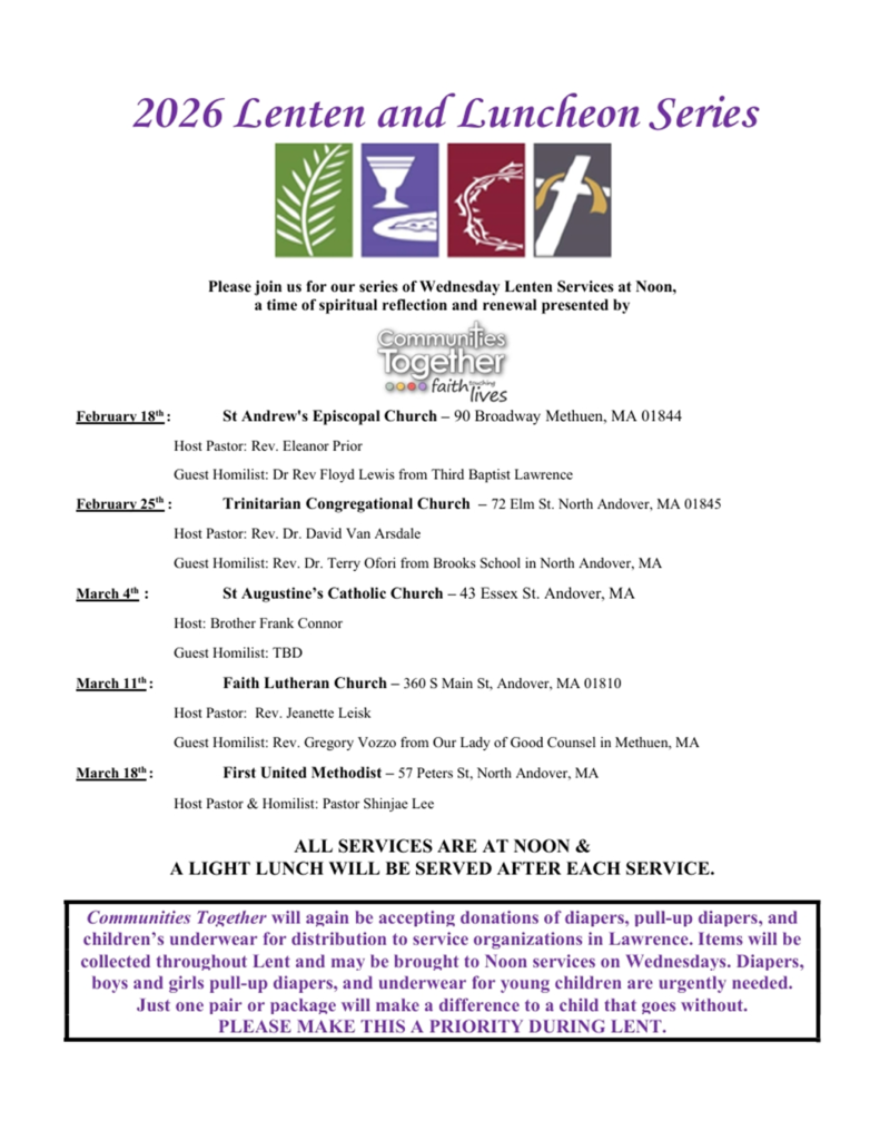 Communities Together has been collecting diapers, pull-ups and underwear for children in the Greater Lawrence area during the Lenten season since 1998.